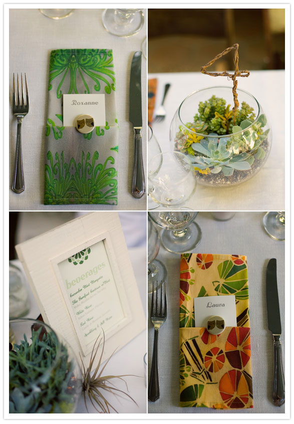 Kelly and Paige immediately knew they had to use Alexandra’s designs in the wedding design. They had custom napkins made, and incorporated her fabric into bunting, bouquet and bout wraps, and tree decors.