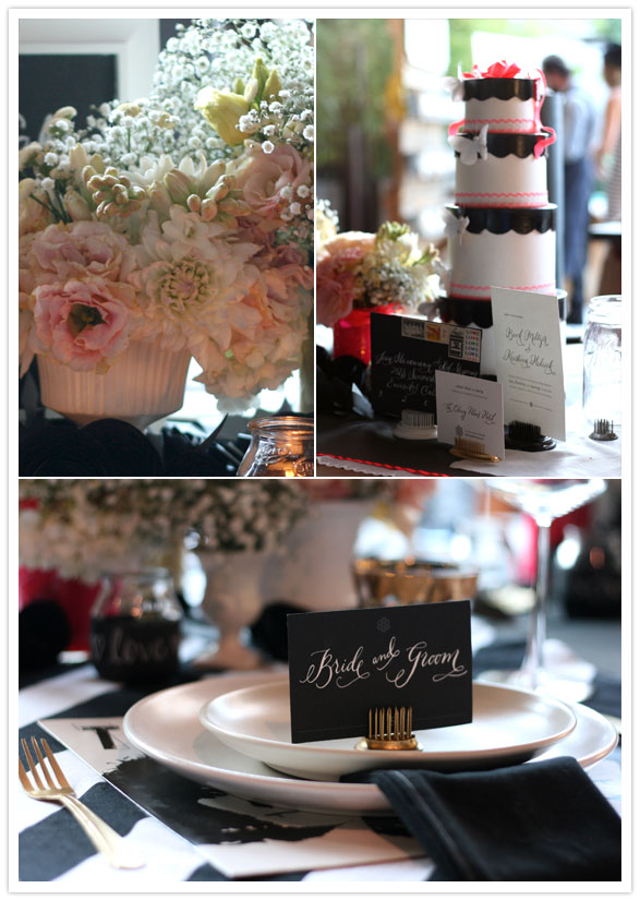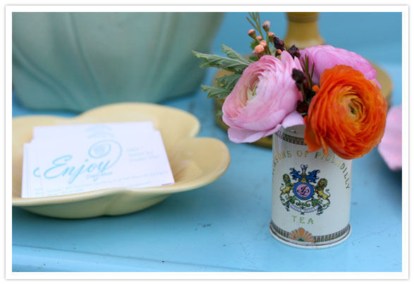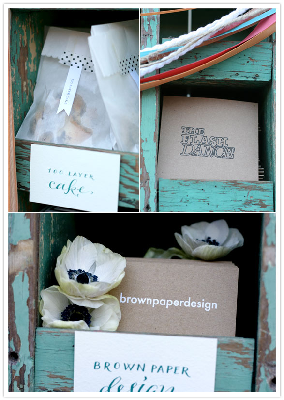 And the goody bag cubbies, with our most delicious homemade chocolate chip cookies, (those unsightly grease spots just mean we use lots of real butter for extra deliciousness.), Flashdance CDs (definitely a hot commodity if you don’t already have your own collection), and leave it to Danielle from Brown Paper Design to find anemones in September. Hopefully you’ve got a good supplier, lady, because you’re going to have brides knocking down your door! And there were tons more cute pressies too.