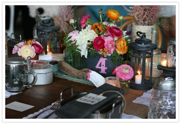Record jacket chargers! And vintage flower frog place card holders. Spray paint is our new best friend.