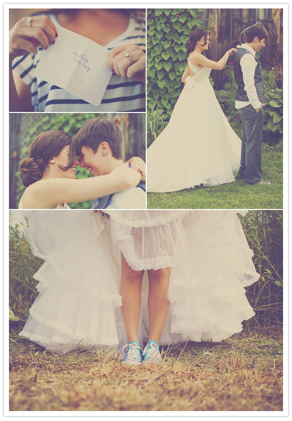 Photography: Matt Miller at Our Labor of Love / Music: Aaron Topfer / Caterer: Let’s Pretend Catering / Cake: BakeAria / Dress & Accessories: Monaco (Designer: Amy Michelson) Birdcage Veil: Etsy, Vanrobmac / Floral Décor & Design: Handpicked by our friends and family / Decorations: DIY / Hair & Makeup: Emily’s mother and friends / Ali’s Attire and Wedding Party Attire: Express / S’mores Kits: DIY
