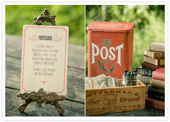 Super sweet idea right here. Guests wrote notes to Kristen & Ben on these 100 year old French postcards and put them in a 200 year old antique letter box during the ceremony… oh the things you can find on eBay! They plan on reading them on their tenth anniversary.