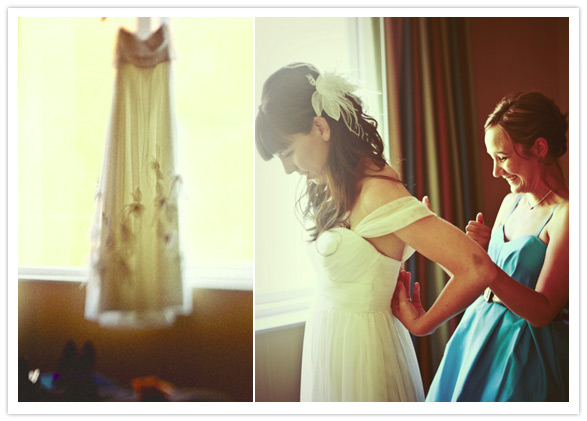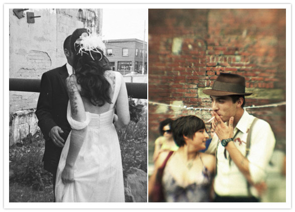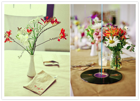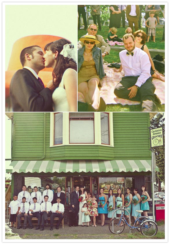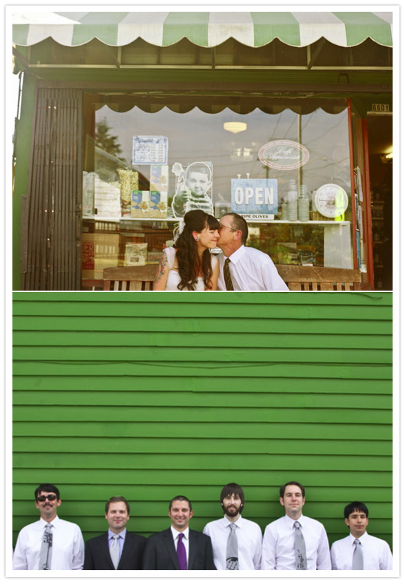Dear readers – Heather from One Love Photo passed Vanessa & Scott’s wedding photos our way and we’re so glad to be able to share them with you today. They got married in Oxbow Park in Seattle and took advantage of the quaint local vendors for fun details and photo ops. Plus, the reception was held in an old brewery, which is as amazing as it sounds. Vanessa did most of the planning, decorating, and flower arranging herself, with help from family and friends as needed (dear old Dad provided the records for the tables – totally cute.)