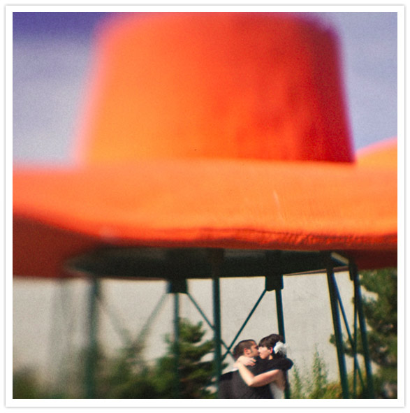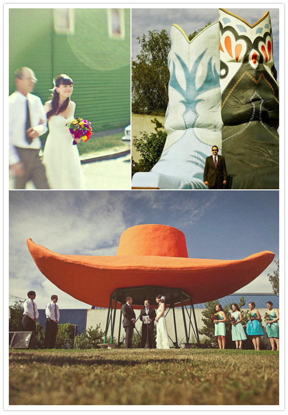 How could you not want to get married underneath a gigantic orange hat? Cute to the nth degree.