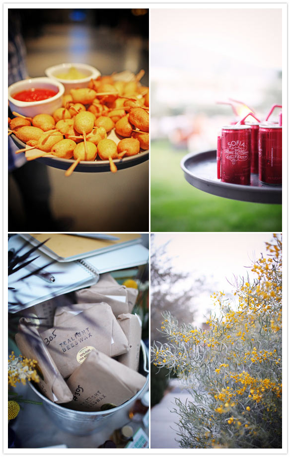 We made some super fun projects for our DIY table, including an embroidered sampler with our logo (yes, for reals!), potato print muslin bags, (bags and other accoutrements found from our DIY resource section), homemade pickled jalapeños topped with burlap fabric, tied with a pretty leather strip, as well as mix matched fabric favor bags, (idea from the latest issue of Martha).