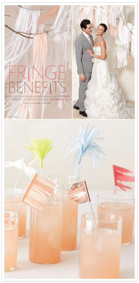 The Spring 2011 issue of Martha Weddings is almost here, and we are thrilled to share a quick peek at what’s in store. With a title like “Fringe Benefits,” our minds were running wild with the possibilities for beautiful details, and Martha’s team totally delivered. They worked with Julie and Nick of Confetti System to explore fringed decor, including bouquets, stationery, cake, escort and seating cards, favors, and even a photo booth backdrop.