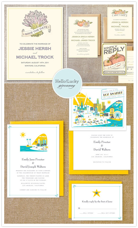 This is such a super awesome giveaway, cakelets. In celebration of the new designs Hello!Lucky has debuting this week, they’re giving away 100 save-the-dates with printed envelopes plus a copy of Handmade Weddings (their ultra cute book we posted about a while back) to one v. lucky reader.