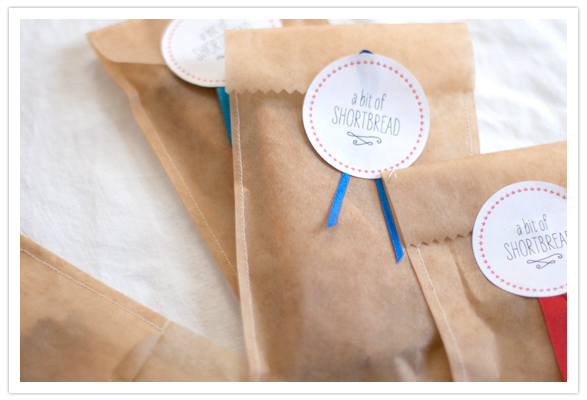 Wouldn’t these be cute in a shallow wooden crate, all lined up together with different ribbons? Perfect midnight snack after a night of dancing! Kristina posted the shortbread recipe on her personal blog this morn too, for those of you in the mood for a little baking.