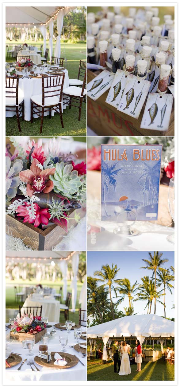 Wooden box crates and vintage napkins purchased at vintage expos, Etsy and Ebay provided the vintage-inspired look, while test tubes filled with Hawaiian Black Lava Sea Salt or Hawaiian Red Alaea Sea Salt (assembled by the couple themselves), gave way to the seaside garden party feeling they were after. Success!