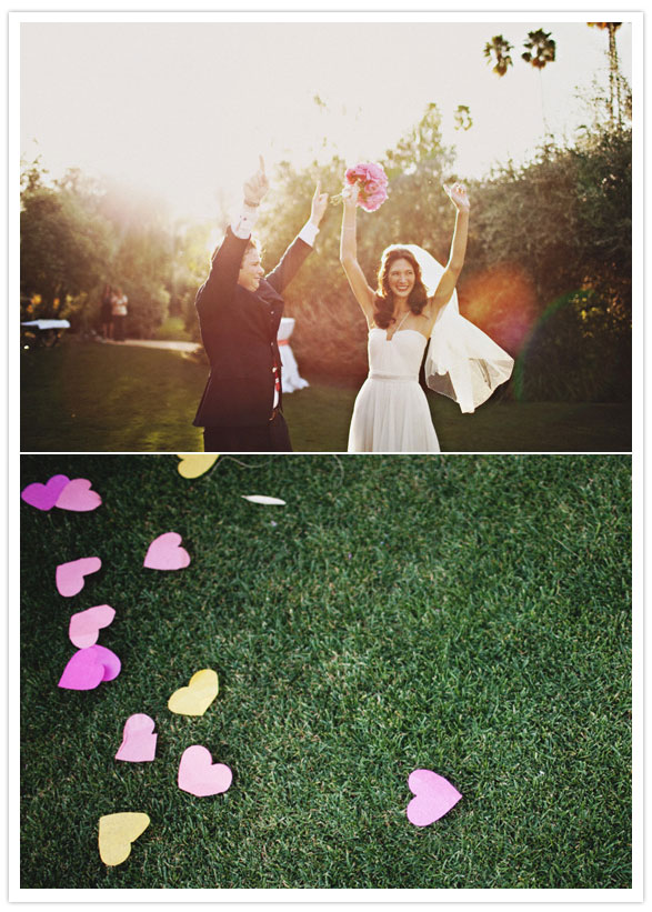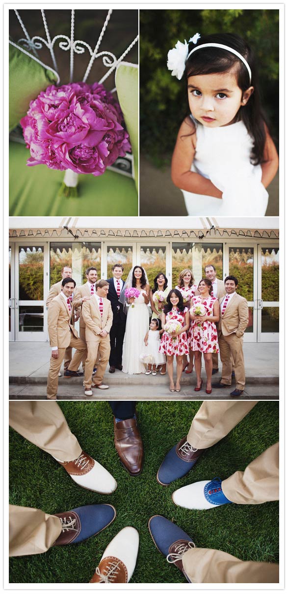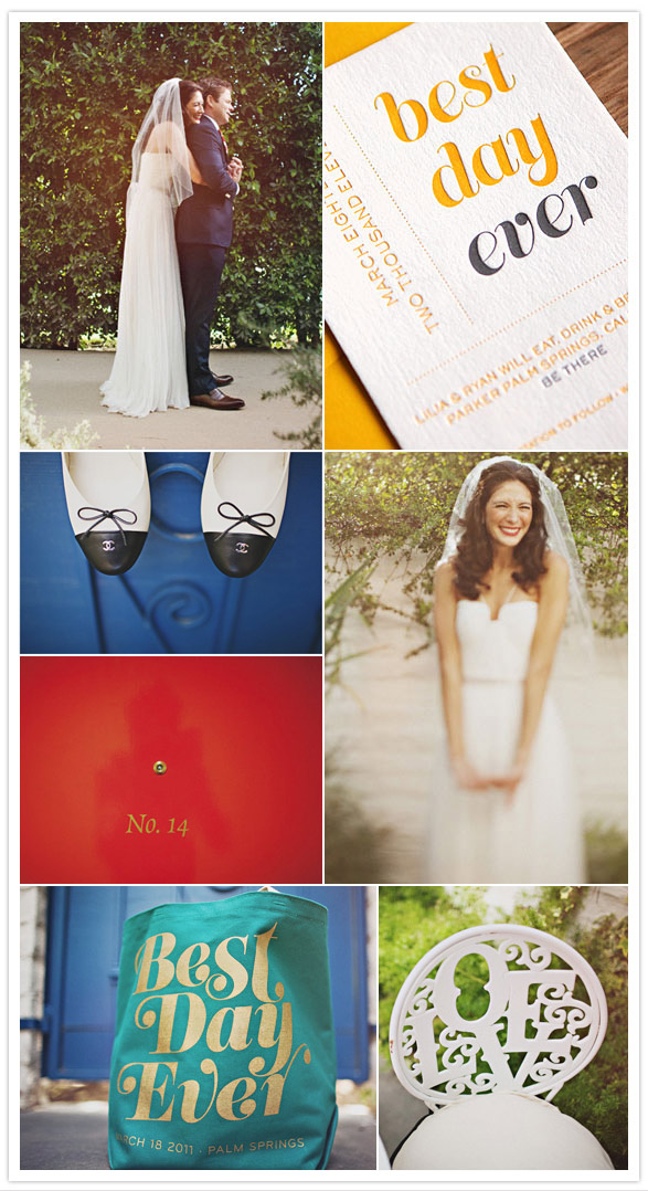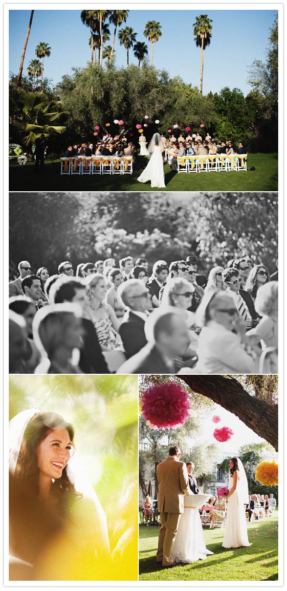 Photography: Sean Flanigan / Venue: Parker Palm Springs / Poms + Pomfetti: PomLove on Etsy / Favors: Jonathan Adler Bud Vases / Flowers: Jensen’s Florist (in a grocery store! they did the most incredible job for a fraction of the cost) / Linens + Lights: Signature Party Rentals / Stationary: Lilia DeGregory (Bride) + Alberta Testanero / Printer: MK Printer + Soho Letterpress / Best Day Ever Welcome Totes: Enviro-tote / Wedding Planning + Event Design: Lilia DeGregory (Bride) / DJ: Neil Jackson (friend from NY) / Officiant: Jack Stroker (father of groom) / Dress + Belt: Reem Acra (had straps added) / Veil: Toni Federici / Shoes: Chanel / Groom Suit: Billy Reid / Groom Shoes: Paul Stuart / All Groomsmen + Officiant Ties: Billy Reid / Groomsmen Suits: J Crew / Groomsmen Shoes: Cole Haan / Maid of Honor Dress: J Crew / Bridesmaids Dresses: BB Dakota / All Bridal Party Shoes: kate spade / Bridesmaid Jewelry: BaubleBar / Flower Girl Dress: Us Angels