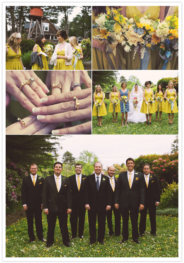 Photography: Feather Love Photography / Venue: Glendeven Inn / Wedding planner: Sonya Houston from Mendocino Weddings / Floral: Mendocino Floral Design / Cake: Mendo Cakes / Band: Gaucho / Tents & Equipment: Wine Country Party Rentals / Catering: Boonville Hotel / Bread wreaths: Fort Bragg Bakery / Groom’s suit: Armani / Bride’s dress: Oscar de la Renta / Bride’s necklace: Anthropologie / Bridesmaid’s dresses: BHLDN / Brides hair and make-up: Erin Dunkley of Honeycomb Salon, San Francisco / Bridesmaid’s hair and make-up by Mendocino Beauty / Bridesmaid’s gold now rings: Kate Spade / Letterpress escort cards and table numbers: Austin Press, San Francisco / Pom-poms: made by bride’s mother / Baby animals: Mendocino 4H club / Officiant: Bride’s sister