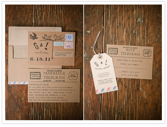 For our invitations and rsvp’s we went through a vendor we found on Etsy, Aurelisas, who offers simple vintage telegram style invites. We then used decorative (air mail looking) tape to personalize them and used our G&L logo stamp on the outer envelope. We also made luggage tags as an invitation to the cocktail party we hosted the night before the wedding. All together for our save the dates, invites and rsvp cards, we spent under $250 for the paper, rubber and wood block stamps, antique postage stamps.