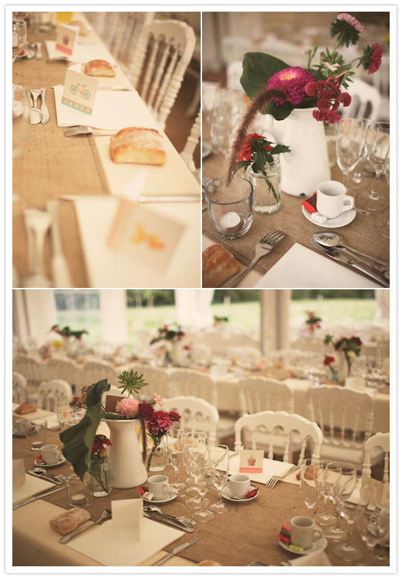 Decorations were kept simple, all DIY, and totaled around $400. Family style tables were covered with a simple burlap runner stitched with blue thread, white IKEA vases, and jam jars that had been collected over the year prior to the wedding. Monique & friends also went to a farm to pick flowers and made each of the arrangements themselves.