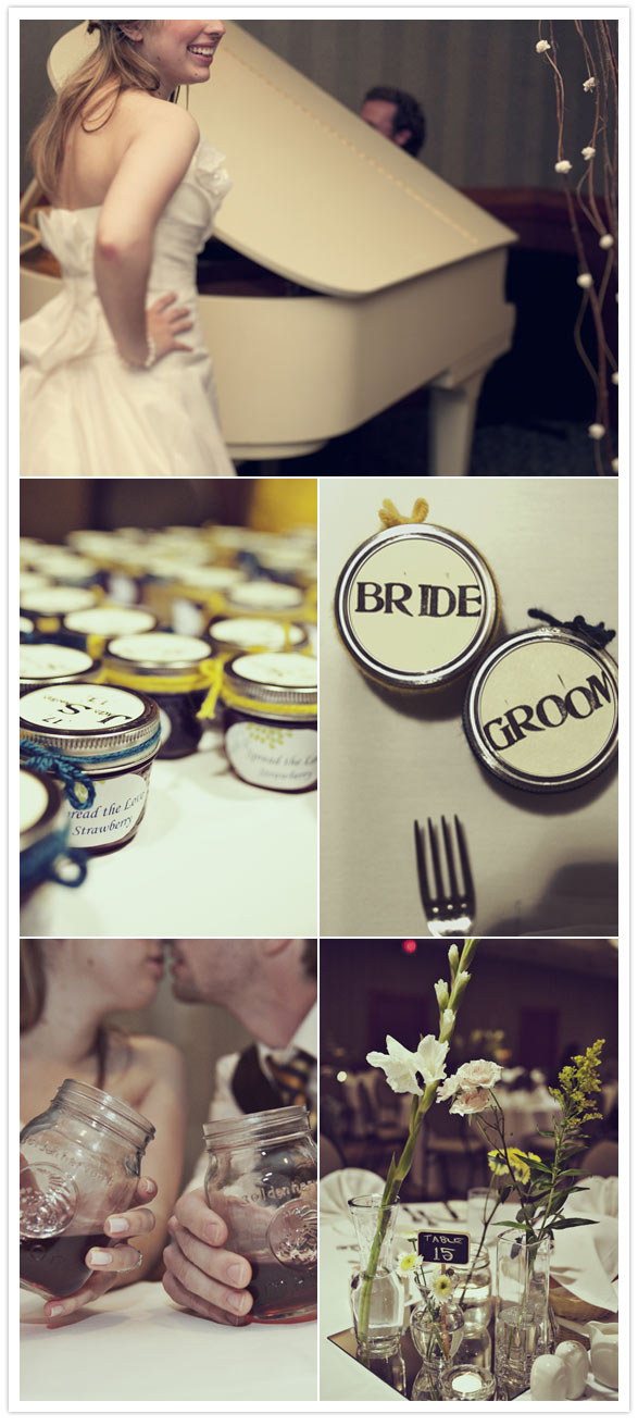 The favors were small jars of jam made by Cydney and mother-in-law. Each jar was tied with a different colored piece of yarn to indicate the guest’s choice of entrée. Jam jars were purchased at Canadian Tire ($120 for jars).