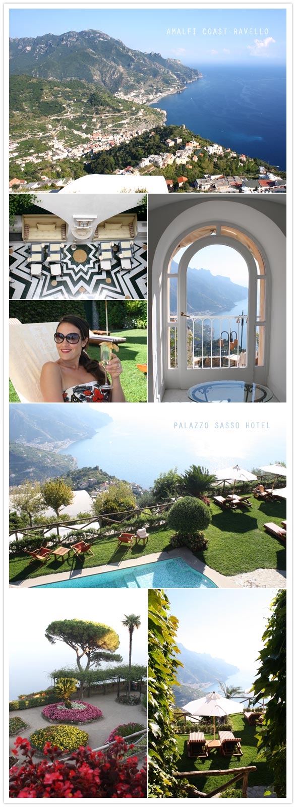 One of the final destinations on our Italian tour were the little towns on the Amalfi Coast! Ravello, Amalfi, Positano, Sorrento, Capri and Pompeii were on our list. Each had their very own different feel..Ravello was like heaven…a tiny town situated way up high near the sky, with unbelievable views everywhere we went. It also helps that our hotel, Palazzo Sasso, was the absolute perfect spot to start our Ravello experience. Below are some photos taken at the hotel (and the bottom left photo is from Rufolo Gardens, right down the street). We had the BEST service at Palazzo Sasso, the food and drink were outstanding (although a little pricey so we limited ourselves), and the pool area was something out of a dream. Honeymooners…this is your hotel!