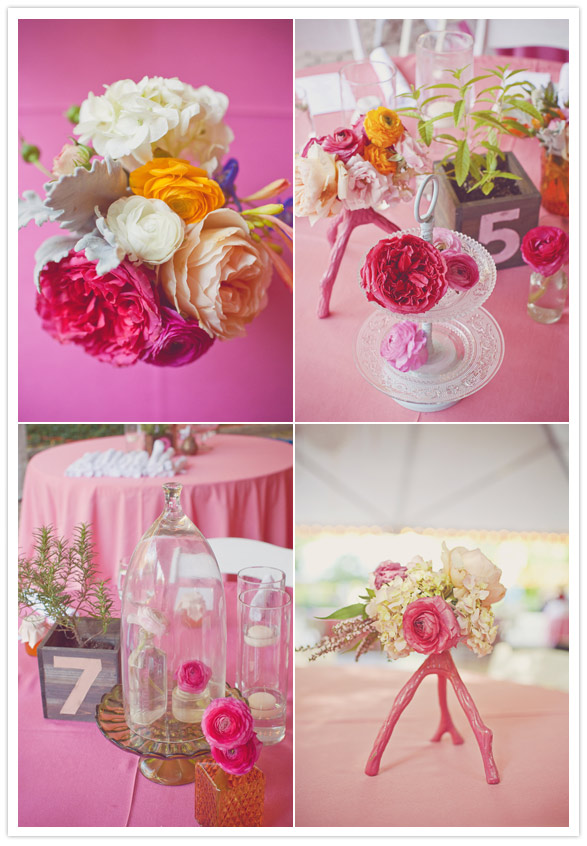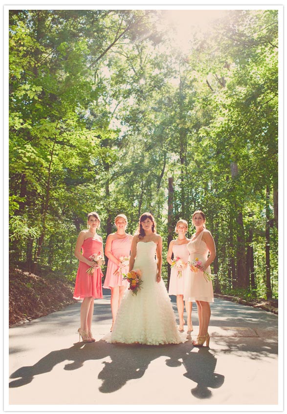 We wanted an indie, garden theme with a vintage feel and really loved the idea of gradients. Ombre and gradients are really beautiful and while sticking our heads together with Amy Osaba, the idea got pushed into fruition. We took the idea of gradated table linens and then used that to pick out the bridesmaids dresses. Then I used the bridesmaid fabric swatches to bring to the bakery for a gradient cake inside and it continued from there.