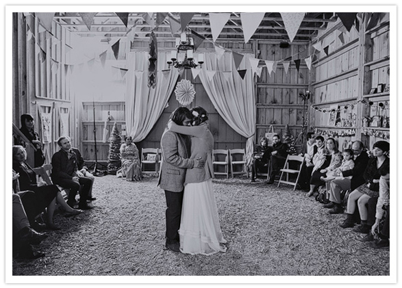 Photography: Matt Miller at Our Labor of Love / Venue: The Barn at Price Mountain Farm / Florist: Gardenia Floral Design / Caterer: home.made catering / Invitation design: Bride (Lauren Gregg) / Bride’s dress: Claire Pettibone / Shoes: Steve Madden / Headpiece: Mignonne Handmade / Groom’s jacket: J.Crew / Pants: Banana Republic / Boots: Giorgio Brutini / Bowtie: Lauren Gregg + Whitney Deal / Bridesmaid dresses: Bride (Lauren Gregg) + Whitney Deal / Groomsman attire: Levi’s (pants), Urban Outfitters (shirts), Lauren Gregg + Whitney Deal (ties)