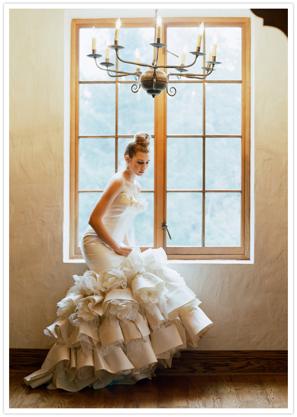 Anne Barge strapless silk organza gown with knotted bodice. Organic cotton capelet by Holly Stalder.