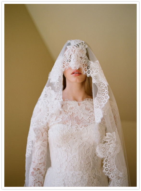Monique Lhuillier long-sleeved re-embroidered Chantilly lace gown and Monique Lhuillier hand-appliqué lace and tulle veil.