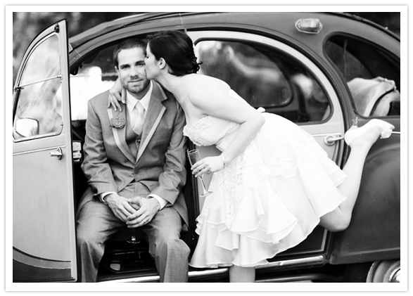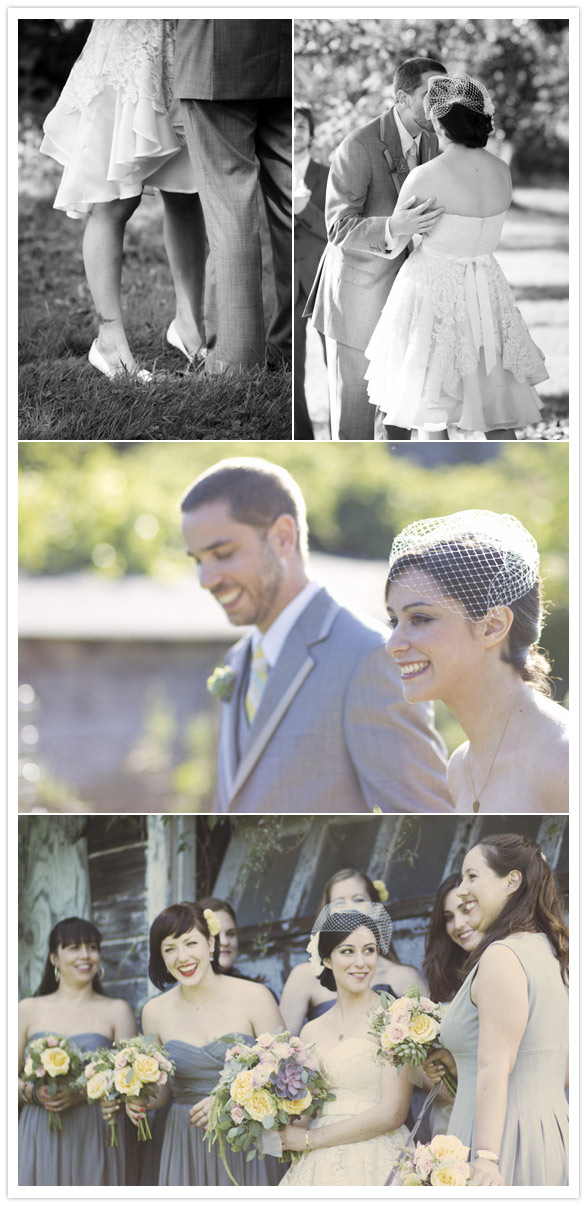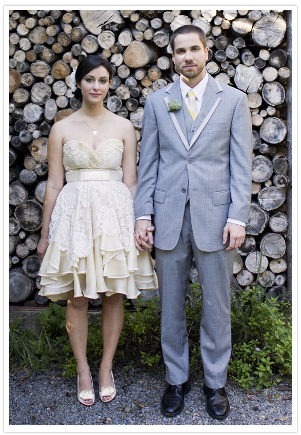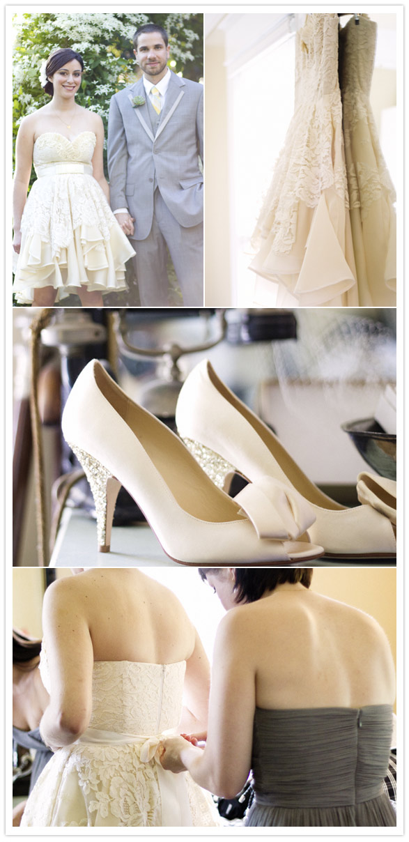 Is it any secret that we love Project Runway? Last week you may have seen us feature a bride in an amazing Christian Siriano gown. Today, we’re rolling with the PR love by sharing another adorable bride, this time in a one-of-kind Leanne Marshall dress! We first discovered Lesley + Galen’s wedding on Kate Miss’ blog For Me, For You. The soft ivory & delicate lace in Lesley’s dress (taken from her mother’s wedding dress) and glitzy Kate Spade heels were like icing on a cupcake. Then we found out that Lesley blogged about the experience of having Leanne as her personal designer! Lucky gal!