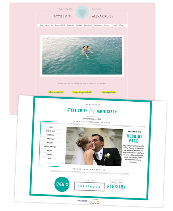 We know there are some pre-brides among us – the Cakelets that just know their hunny is going to propose to them over the holidays. If that’s you, let us congratulate you ahead of time (yay!). Now let us introduce you to Wedding JoJo, the place to go for cute customizable websites. For the ladies with a ring on it checking out Wedding JoJo for the second time, good news, the Mist and Craft themes (featured below) are now fully customizable via a color picker. On top of that, they now offer full integration with their sister site/honeymoon resistry, Registry JoJo.