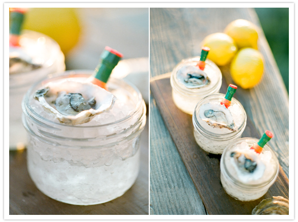 This is by far the cutest way to do appetizers during your cocktail hour. An oyster shot prepped with a mini Tabasco bottle!