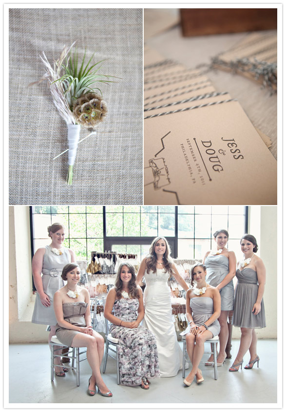 The wedding of Jessica + Doug was modernly crafty, urban, and perfect for a couple with roots in Seattle, Philadelphia, Portland and now Los Angeles. Rightfully so, it paid homage (food wise) to all the regions they’ve called home and tilted a hat to Philly with a movie screening of Audrey Hepburn’s The Philadelphia Story – vintage theatre seating and all. Stumptown coffee roasted in Portland, Northwest microbrews, New Hampshire blueberry crumble…as you can see they made a specific choice for every part of the process, then had the visionary talent of Styled Creative to give the details that gorgeous touch!