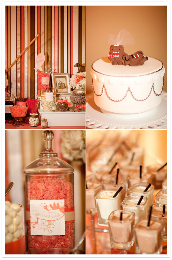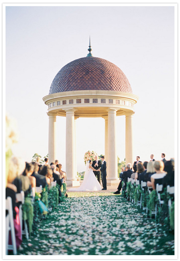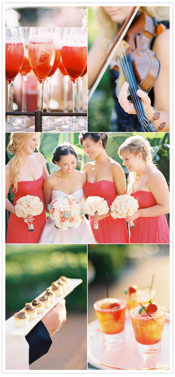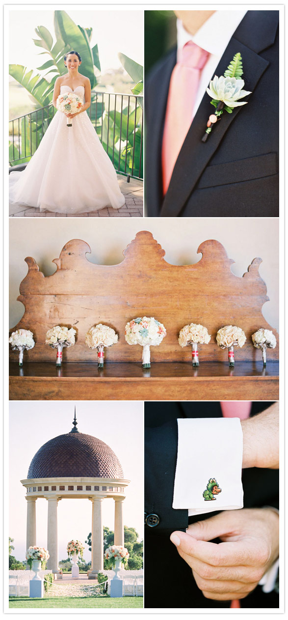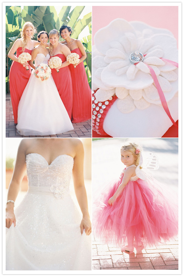 Photography: Caroline Tran / Wedding planner: Amorology / Florist & lighting: Squareroot Designs / Videography: Taylor Films / Hair: Stacey Nanto of Jule Salon / Make-Up: Megan Anderson / Rentals: Concepts Event Design / Invitations: Brightly Designed / DJ: Tim Altbaum Productions / Venue: Pelican Hill Resort / Bride’s dress + veil: Ines di Santo / Bridal + bridesmaid shoes: Jimmy Choo / Jewelry: Bride’s grandmother’s silver bracelet, earrings made to match by Nuggets and Carats / Groom’s + groomsmen suit + shirts: Gary’s Studio / Bridesmaid Dresses: Amsale from The White Dress / Flower Girl Dress: custom made by Fluffy Tuffies on Etsy / Domo Cake Topper: The Air Castle / Linens: La Tavola Linen
