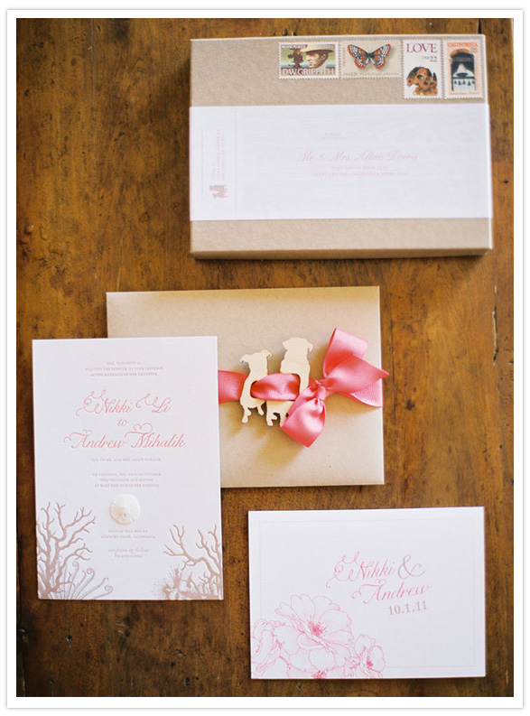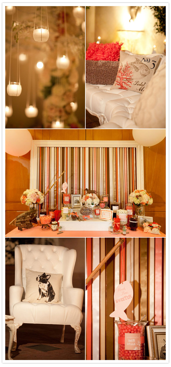 Imagine the look on Heather, of Amorology‘s face when Nikki, our bride, told her they wanted the theme of their wedding to incorporate fish and dogs. Not just that. It had to be done elegantly. Really, what does one do with that? When you’re Heather, you take that idea and run with it! First, the color palette was determined – coral would be an accent color, creams and browns as neutrals, fish scales and wood as patterns, and kraft paper and twine used as basic supplies. From there, the most adorable and creative wedding was born (fish and dogs included)!