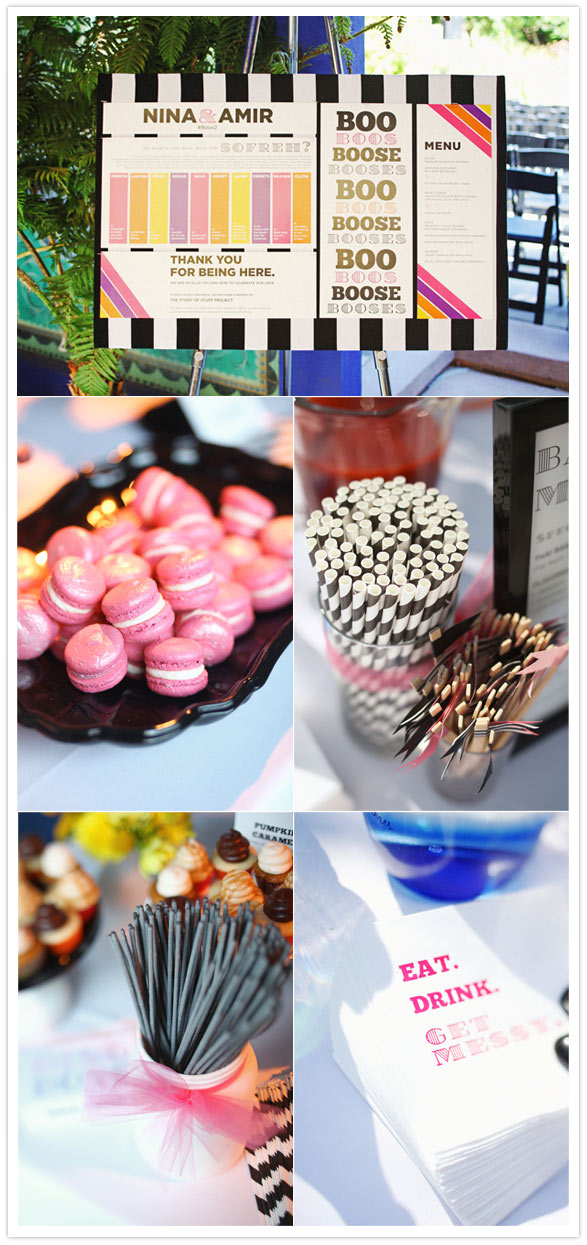 Nina + Amir are two worlds but one heart. Both actor/comedians, she hailing from NYC and he from San Francisco, they have a love for eclectic, dramatic, flair and crazy fun. Their wedding was bound to be colorful in more ways than one. Bright pops of modern patterns mixed with French Moroccan elegance meet up at one of L.A.’s eco-friendly venues, Marrakesh House. Nina + Amir allowed us to take the traditional elements of a wedding and spin them into nouveau carnival. There’s a modern interpretation of a Persian Sofreh and a hookah lounge, both a nod to his heritage. We hired a tarot card reader and a fortune teller, a nod to her whimsical interests. Comedians dressed up as drag queens interviewed guests on video. A gospel choir played their processional. Pops of color in rainbow hues mixed with black and white sophistication set the tone for a playful reception. Nina wore a hot pink Valentino party dress for dancing.