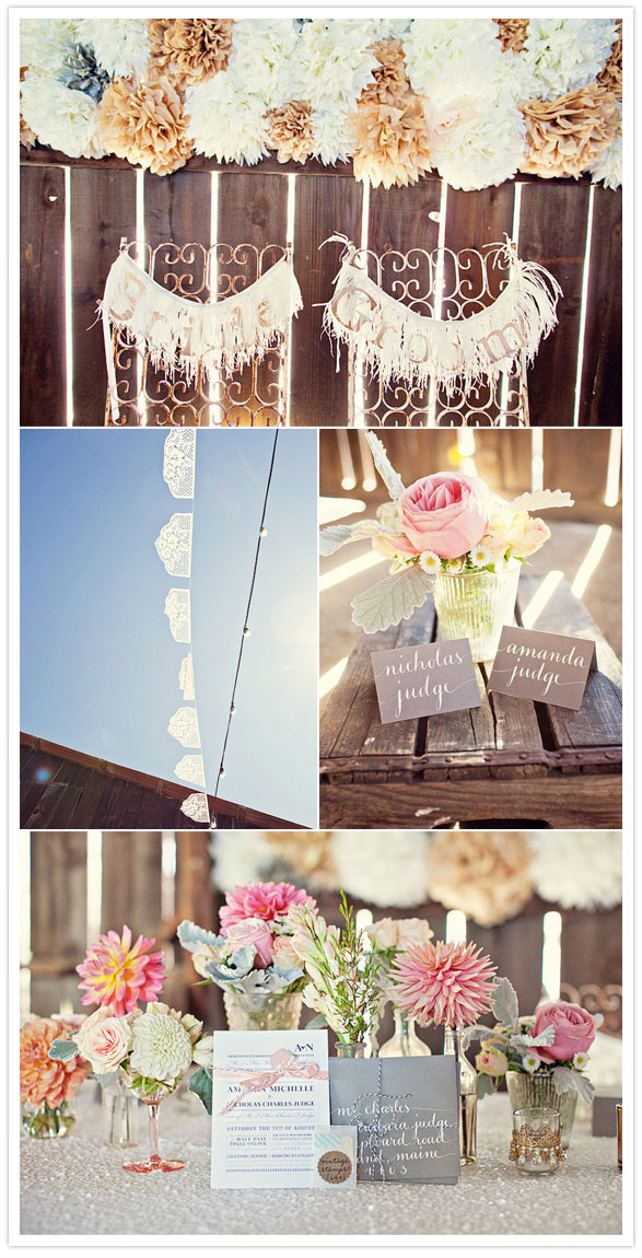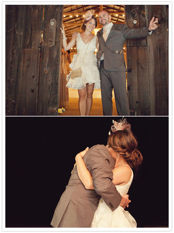 Photographer: Ellie Grover / Videographer: Curtis Nemetz / Venue: The Dana Powers Barn in Nipomo, CA / Catering: In Good Taste / Linens: La Tavola / DJ: Paul Thompson Entertainment / Hair & Make-up: The Queen’s Bees / Flowers: handmade with friends and family / Invitation design: custom by Emily Baker Creative / 3 tier cake: Missi Cakes / Mini cakes and desserts: Two Birds Bakery / Brides 1 st dress: Monique Lhuillier “Meriah” / Brides 2 nd dress: Ivy & Aster “Sass” from Lovely Bride / Brides headpieces and veil: made by the bride Untamed Petals / Bride’s cocktail hat and garter: made by her bridesmaid Lo Boheme / Grooms suit: Kenneth Cole/ Shoes: Badgley Mischka (hand embellished by the bride) / Brides bracelet: Chanel / Earrings: vintage / Bridesmaid dresses: custom made by family friend / Bridesmaid sashes and accessories: made by the bride Untamed Petals / Calligraphy and placecards by: LetterBeonEtsy / Bride & groom signs & wooden signs: Lemonade Designs / Getaway car: Jaguar from British Sports Cars San Luis Obispo / Ribbon curtains, giant paper flower wall and all other decorations: handmade by the bride and friends