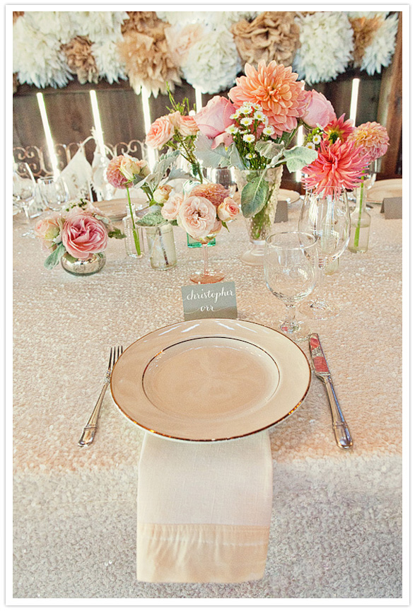We bring you to the second half of Amanda + Nick’s breathtakingly flawless wedding! Part one gave us a close look at Amanda’s stunning Monique Lhuillier tulle and beaded gown and dazzling accessories. Now we move to the details (if you could only hear the excitement in our voice), where crystal chandeliers and tulle join together to set the perfect ceremony backdrop, sequin and ruffle table linens exist, and dahlias sit pretty in orange, pink, and peach ombre tones.