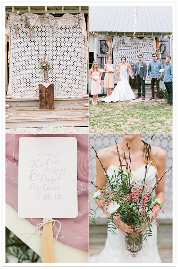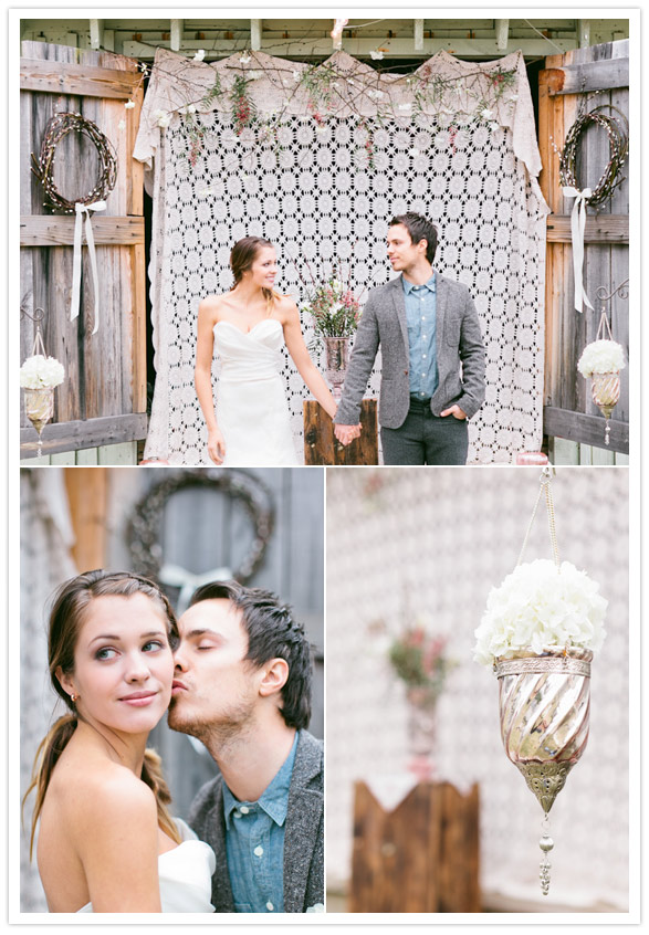A crocheted vintage tablecloth served as a delicate backdrop to the altar where the couple said their “I Do’s”.