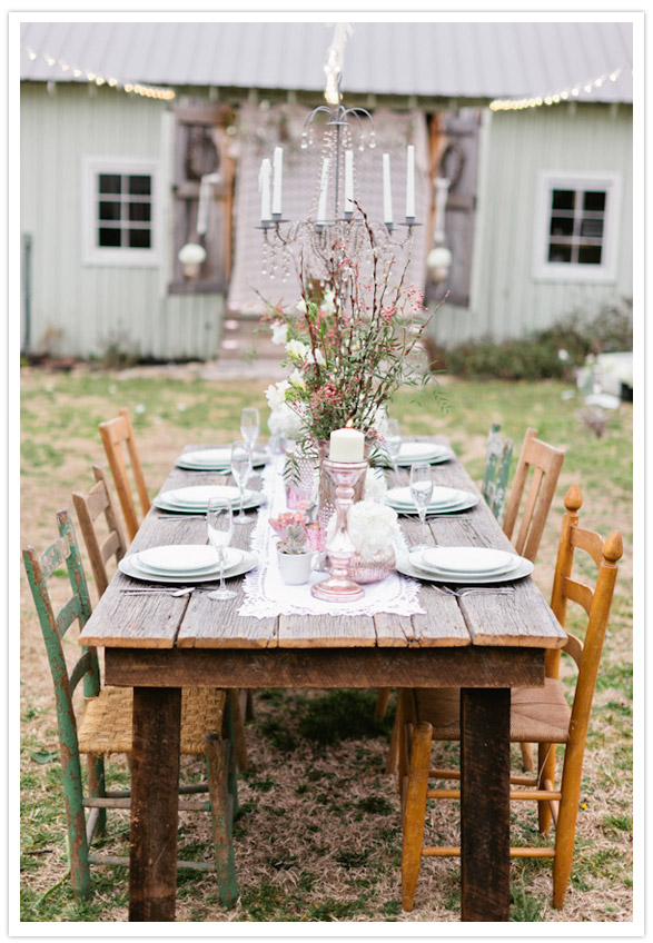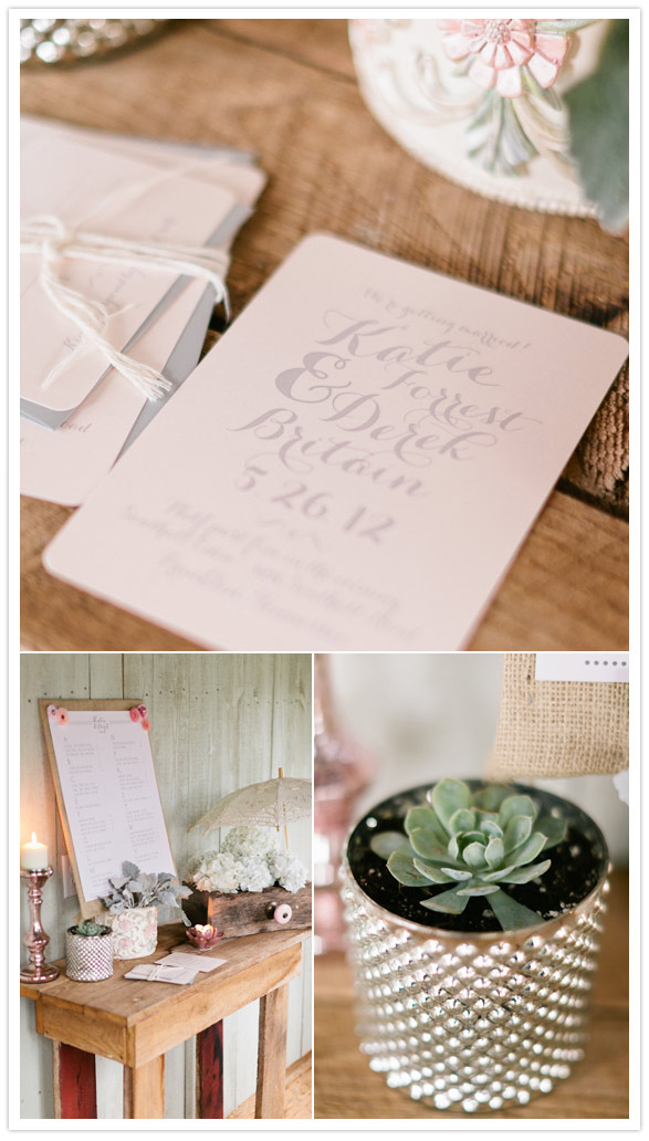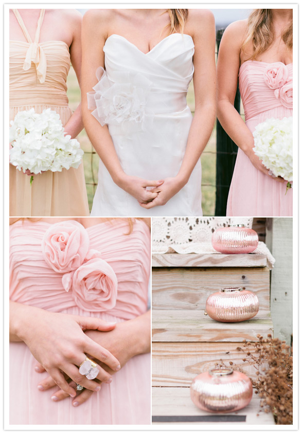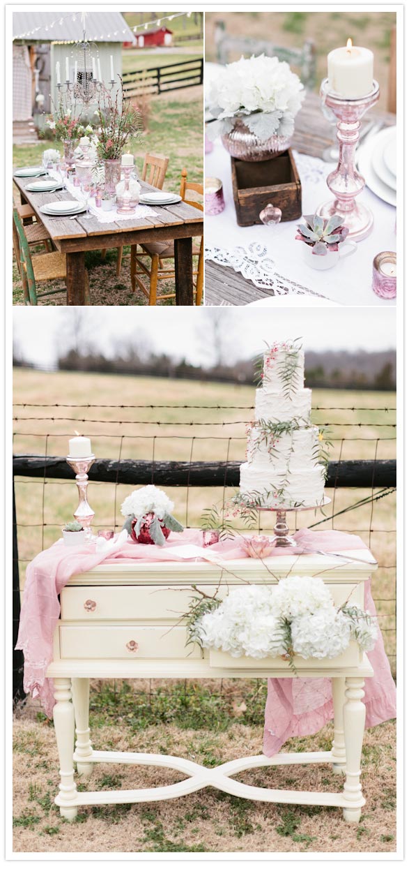 There’s a reason the phrase pretty in pink exists, aside from it being an awesome 80s movie. Things just look prettier in blush pink, especially when they’re placed with neutral tones, a touch of sage green from a succulent, vanilla bridesmaid dresses, and groomsmen dressed in denim button-ups. Lovers of pink, this quaint afternoon shoot was designed with you in mind! The blush mercury glass vases, pillar holders, tea lights, and pew marker lanterns all add a touch of sparkle and elegance to the rustic outdoor setting and farm tables made of reclaimed barn wood. Take a look: