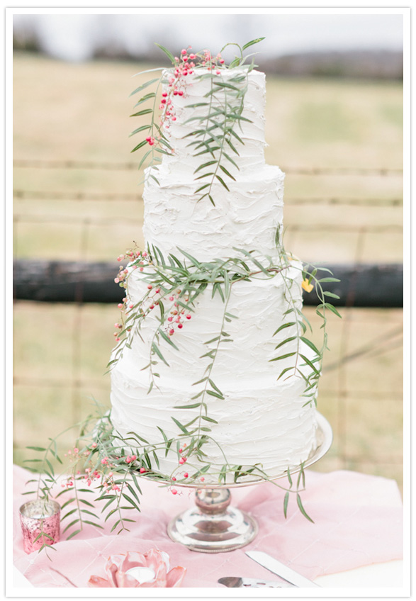 White hydrangeas added softness to the tablescape, while the large hurricane vases of pussy willow branches, freesia, and pink peppercorn berries added drama.