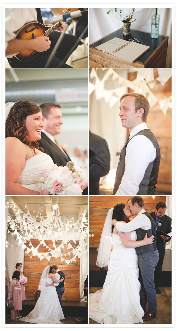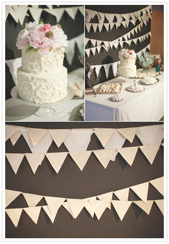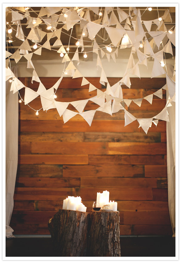 And here’s the white fabric + book paper pendants strung with lighting that we’re loving so much. We don’t know what it would have looked like in their original venue, but we must say, it looks awesome against the wood backdrop.