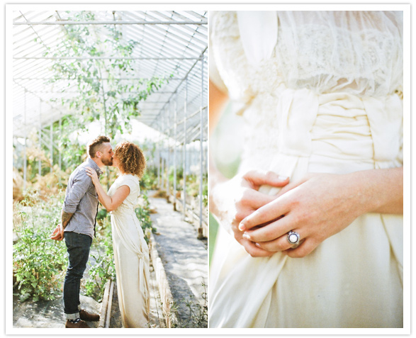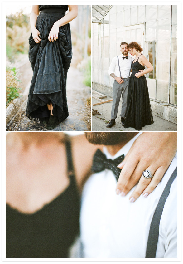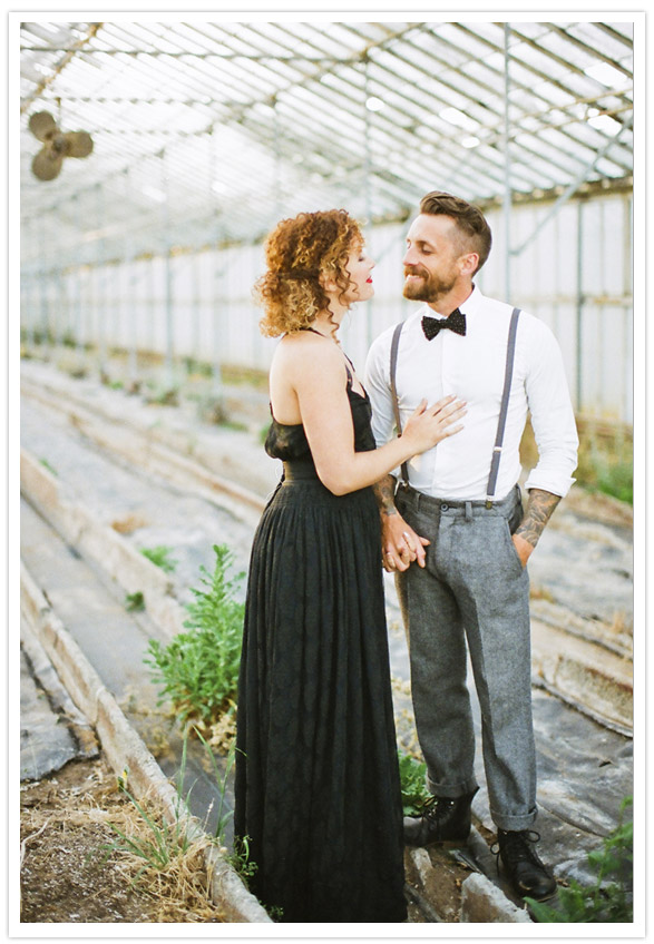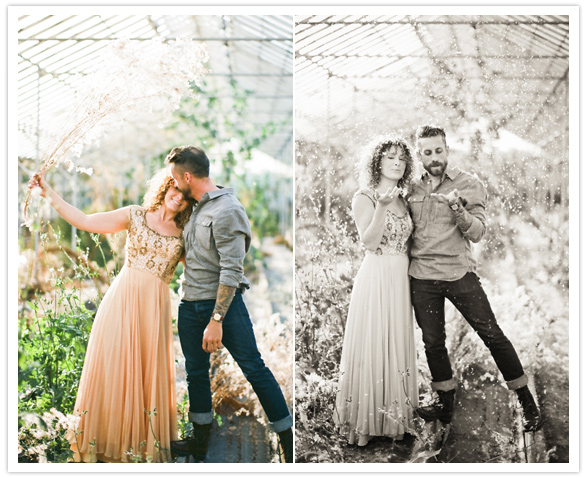 From what we can see, Michelle and Colby are madly in love and have an impeccable taste in fashion. He also knows how to twirl her around in a sequined vintage gown, she knows how to style and design a black dress that kills. They’ll be getting married at a plantation in New Orleans in just a couple of months, but we couldn’t not share these photos asap! Photographer and friend of M + C, Nancy Neil gives us a peek at her gift to them – a fresh, elegant and timeless love sesh in a 1920s abandoned glass greenhouse in Santa Barbara.