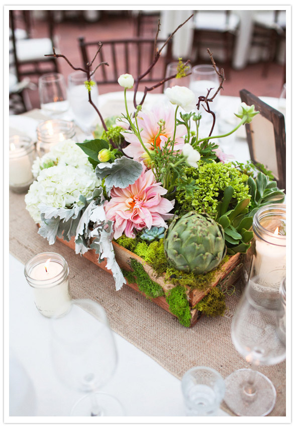Hello, we want these centerpieces! Silvia wanted their centerpieces to look as if they had been plucked from a field… mossy and overflowing… very organic with a combo of white hydrangea, mini green hydrangea, dinner plate dahlias, white ranunculus, artichokes, dusty miller, maiden hair fern, green hypericum, succulents potted, succulents, moss and Manzanita branches.