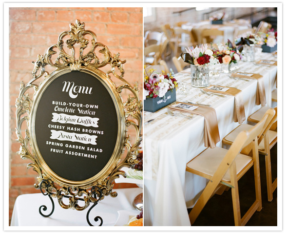 The flowers in Laura + Eric’s wedding are making us want to run out to the Flower District asap! They’re just the type of arrangements that make a pretty first impression when guests take to their tables. That’s not all we’re swooning over. There’s also Laura’s DIY, everything! From gold burlap runners to her altar made of IKEA shelves. With a relatively tight budget of 20k and 100 guests, L + E’s sunday brunch wedding is truly inspirational. And, how cute is this sign?!