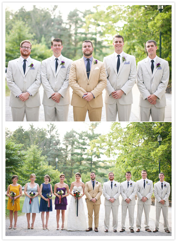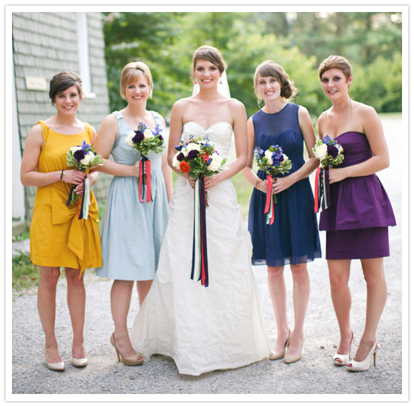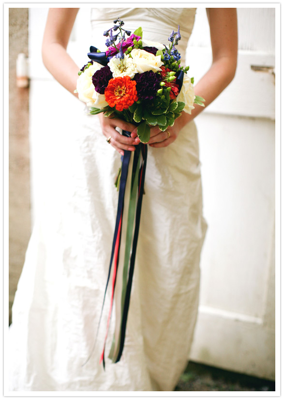 Meghan’s bouquet was a mixture of blue, fuchsia and coral zinnias, white tea roses, dark purple carnations and blue bells, tied with colorful ribbons to tie back to their wedding colors and bridesmaids’ dresses.