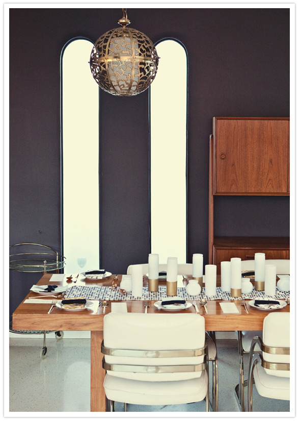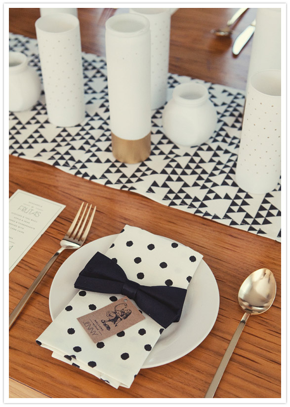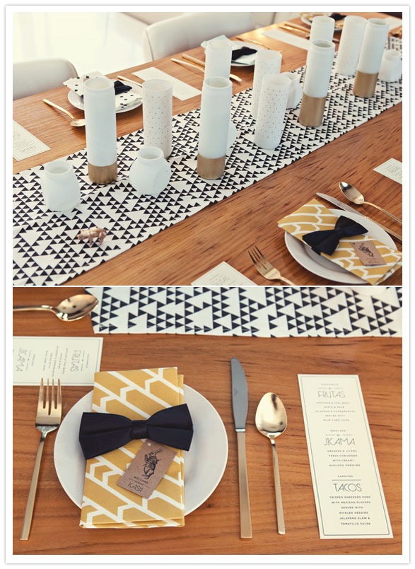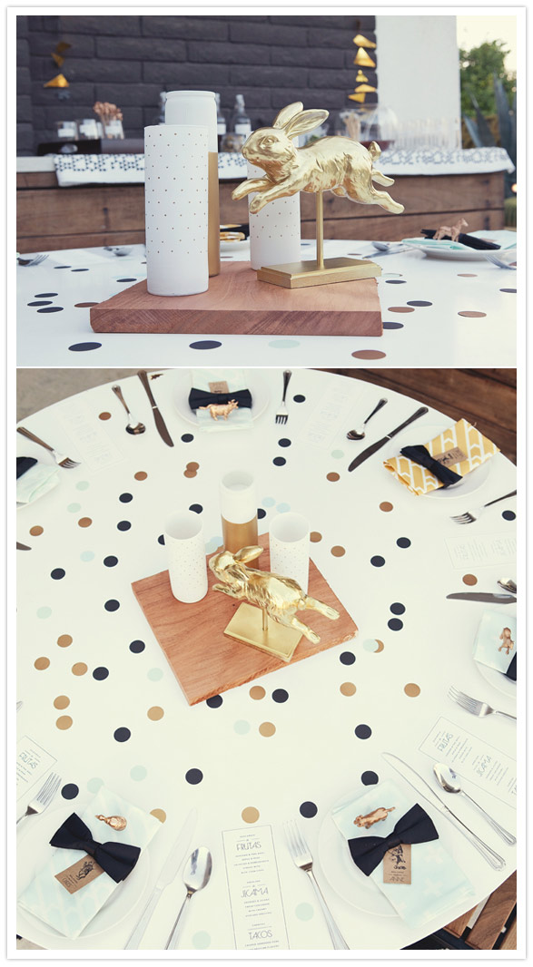 I designed and had printed all of the textiles which I then made the napkins, table cloths, and table runners from. I also made circle confetti to dot the table tops and gold geometric bunting to frame out the bar area. The centerpieces where made of candles and drinking glasses that I bought at the 99 cent store. I sprayed them all white, and then I painted the glass candles to look as though they were dipped in gold, and for the glasses that served as candle holders, I used a gold foil pen to pretty them up with a dot pattern.