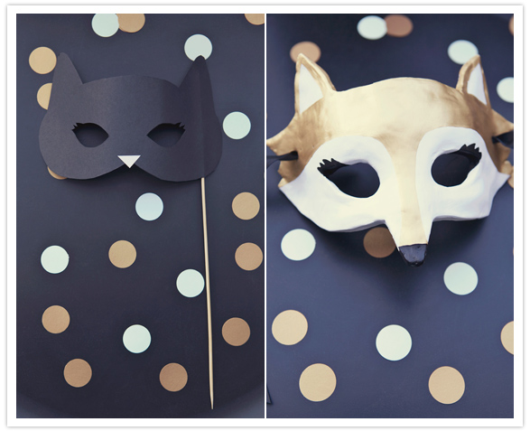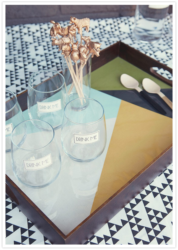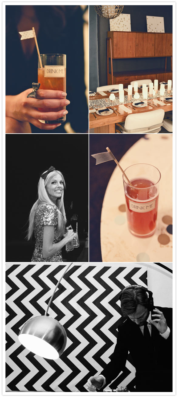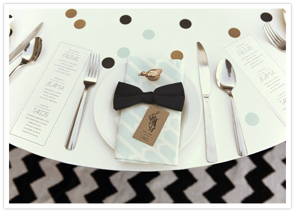 This theme was shown through over-sized bow headpieces, Alice and the White Rabbit Place cards, “drink me” labels on the glasses, top hats, cat mask, rabbit ears, gold painted flamingos, giant paper flowers, and the mix of fanciful patterns. Black bow ties served as napkin ties and double as party favors. As the party went on some of the guests wore them on their heads, around their neck and on their wrists as boutonnieres.