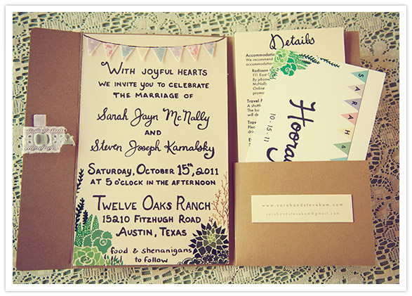 We saved money on our invitations by making our own pocketfolds out of card stock instead of buying them pre-made. I decorated them with ribbon and a logo I had created. Inside I featured my hand lettered text (calligraphy ink and I are now besties), some folk art inspired illustrations of succulents (a la my sister) and a banner of tiny fabric flags up at the top. We had the main card printed professionally, but the cost was manageable since we provided the paper and did the trimming (and embellishment) ourselves. The rest was printed at home – cards detailing travel information, details on our website and a postcard response card. (Loved the postcards – you save on paper and postage! Win!)