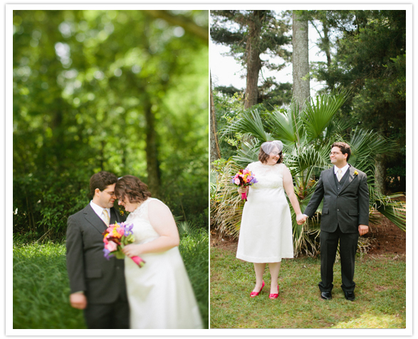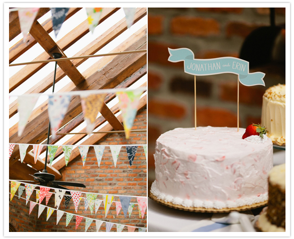 Photography: Morgan Trinker / Rings: Silverwoods, Apples of Gold / Hair: by Jill English at Paris Parker / Bride’s dress: made with love by Mom / Veil: TessaKim / Earrings: Sapphirines (yes, sapphirines, not sapphires) from The Gem Trader set by Texas Diamond and Jewelry / Shoes: Luichiny / Groom’s suit: Brooks Brothers, tie is Michael Kors, shoes are Zengara / Invitations: “Barn Party!” from Minted / Bunting: vintage bedsheets and fabric fat quarters along with wide cotton twill tape from Twill Tape and made using modified instructions from Offbeat Bride / Quaker wedding certificate: Urban Collective / Flowers: Heromans, bud vase flowers from Whole Foods and DIYed by amazing wedding helpers / Cake plates and relish dishes: Ebay and etsy, with one of the cake plates being an heirloom from a beloved great aunt who passed away / Cake decorations: ReadyGo Paper Studio / Ribbon for ring warming: FiniRibbon / Flowered tablecloths: Bride’s own / Rentals: Ginger’s Party Rental / DJ: Brandon Hayes, Press Play DJ / Cakes: Ambrosia Bakery / Fans: Luna Bazaar / Favors: Olde English Crackers