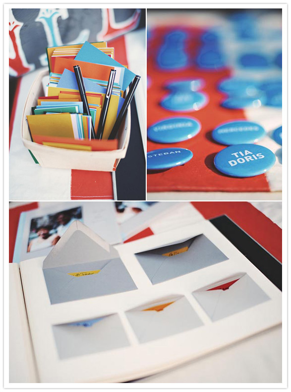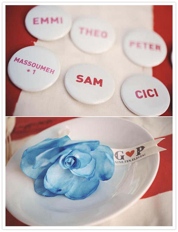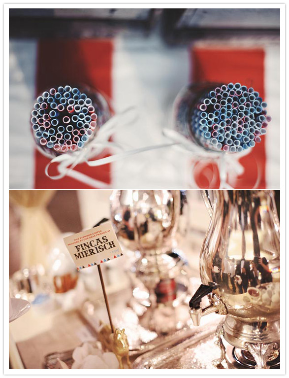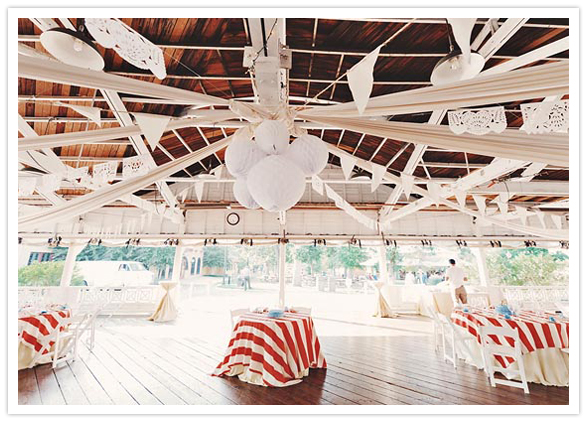 Those eye-catching red & white striped table clothes were made of unbleached muslin and hand painted by G + P. Watch how they made it here.