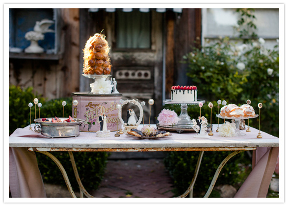 A sweets table with traditional Croquembouches perfect for the French pastry enthusiast (like us).