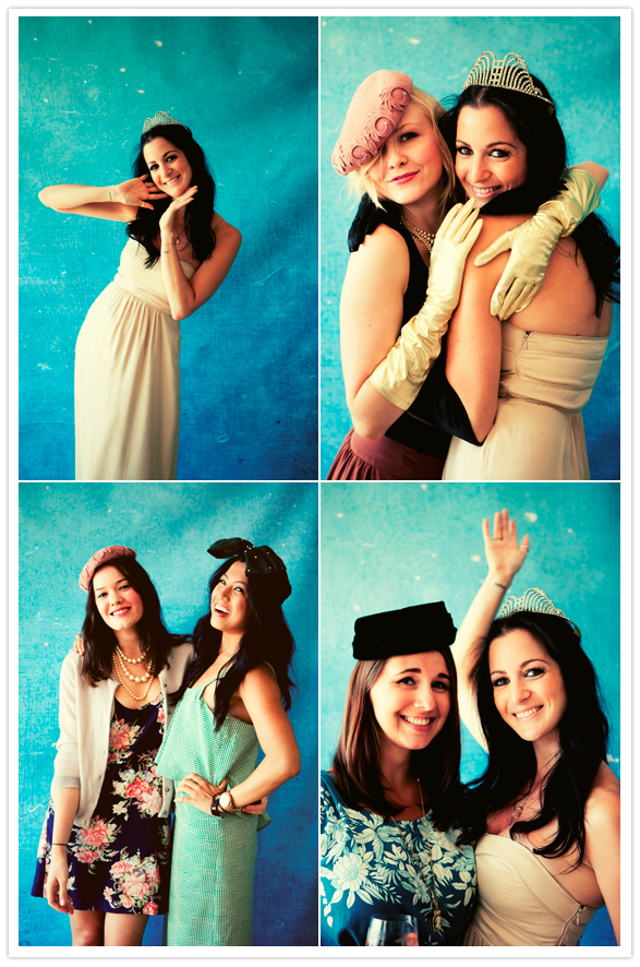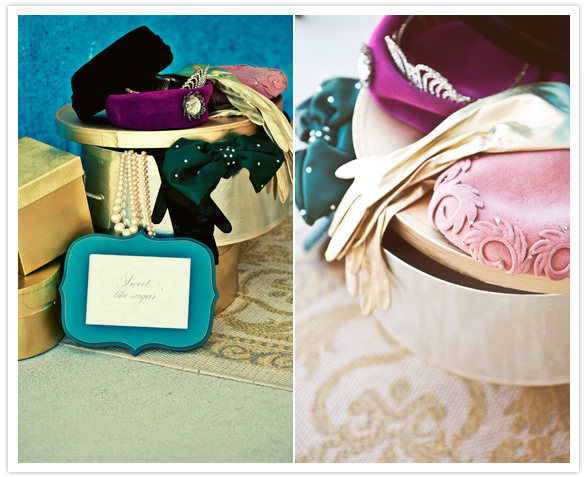 Beautiful 1960s hats/hat boxes and antique jewelry were collected for the photo booth.