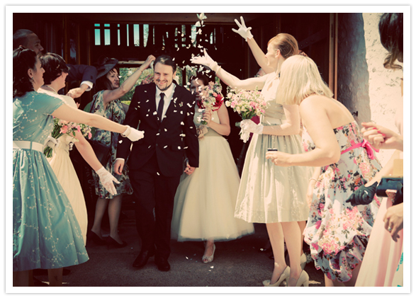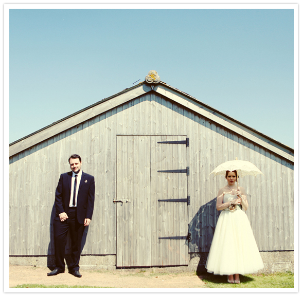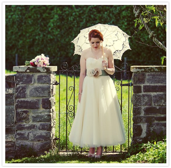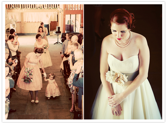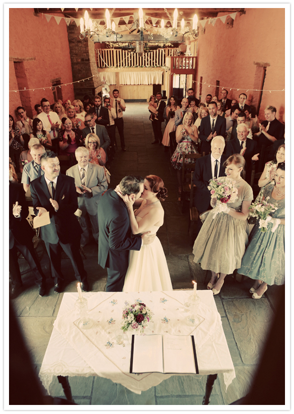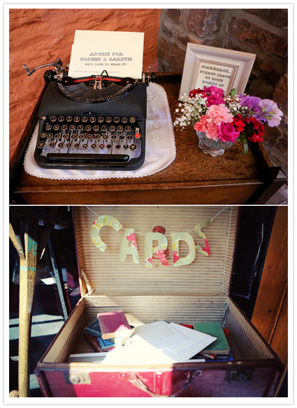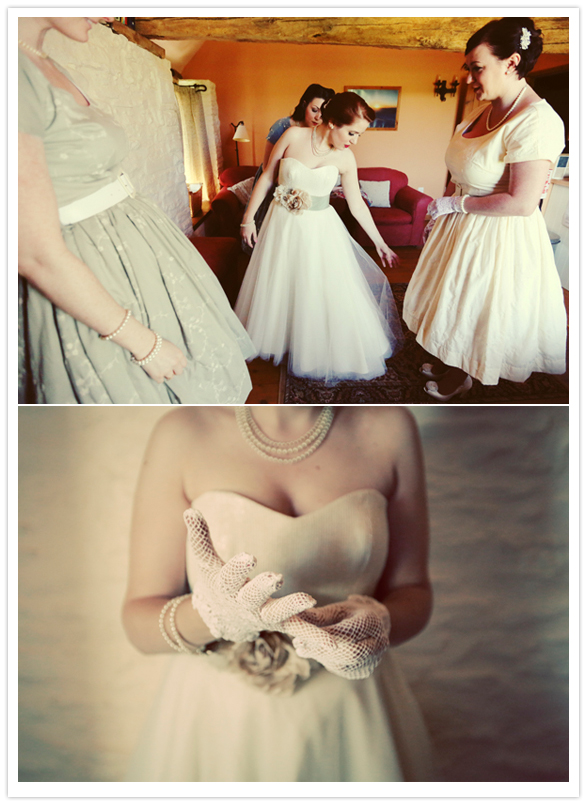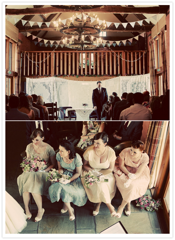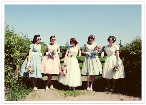 Photography: Maria Farrelly / Ice cream: Rowlestone Court Dairy / Catering: Sugarloaf Catering / Venue: The Barn / Music (band): The Brothel Creepers (a local band who only play 50’s & 60’s music) / Invitations: Old Black Hen / Flowers: Brecon Blooms / China, tandem bike, typewriter rentals: Sipping Pretty / Hair: Esme Walton, Sheer Madness / Make up: bride’s friend Katie / Bride’s dress: Bardot by Stephanie Allin / Shoes: Venetia by Rachel Simpson / Jewelry + purse: vintage / Bridesmaid dresses: Tara Starlet / Bridesmaids’ shoes: Just Because by Seychelles Footwear / Bridemaids’ bags: Disaster Designs / Ladies gloves: vintage / Groom + groomsmen: Slaters / Brooches: Sophie’s grandmothers (vintage)