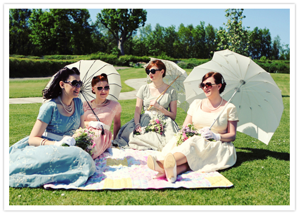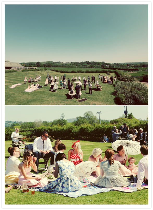 If you’re able to have all of your guests dress in their finest 50’s threads for a vintage inspired picnic wedding, the result could be a fabulous fête like this UK one. The fashion, hair, makeup, and shades were stellar! Every guest participated, and there really wasn’t a detail left untouched. Sophie + Gareth love all things vintage, so they spent a good year trawling charity shops, and antique fairs looking for lace and vintage tablecloths, glass vases and accessories. You’ll love how they pulled it all together…