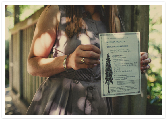The tunes: Andrea walked down the aisle to ‘Harvest Moon’ by Neil Young, they both exited the ceremony to ‘Golden’ by My Morning Jacket, and their first dance was to ‘Into The Mystic’ by Van Morrison.