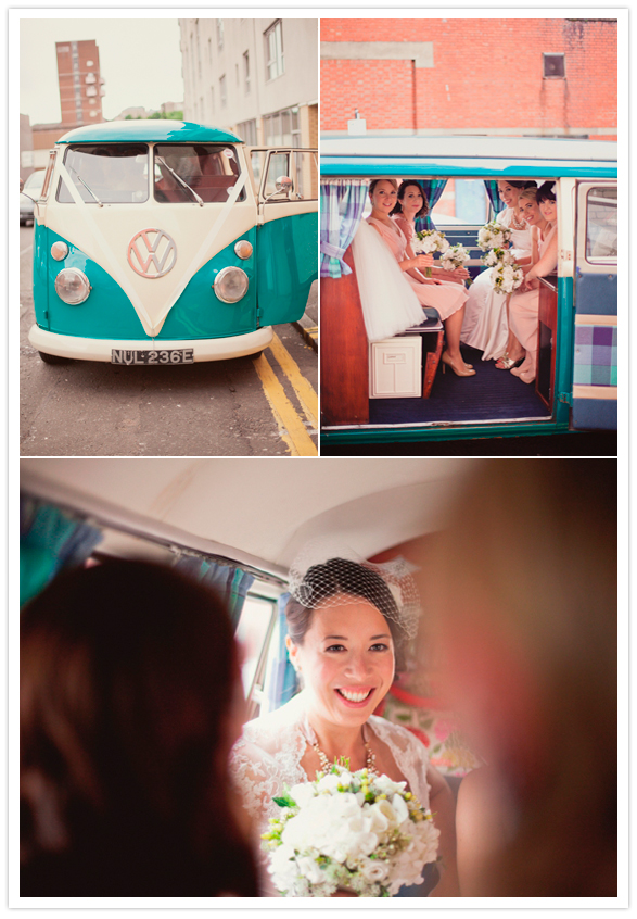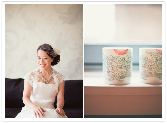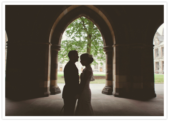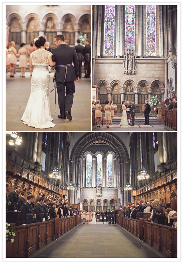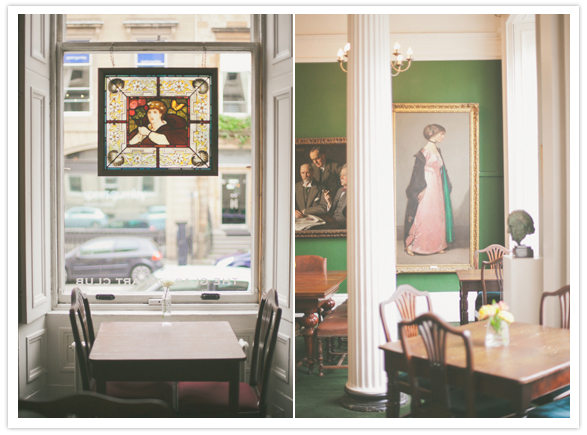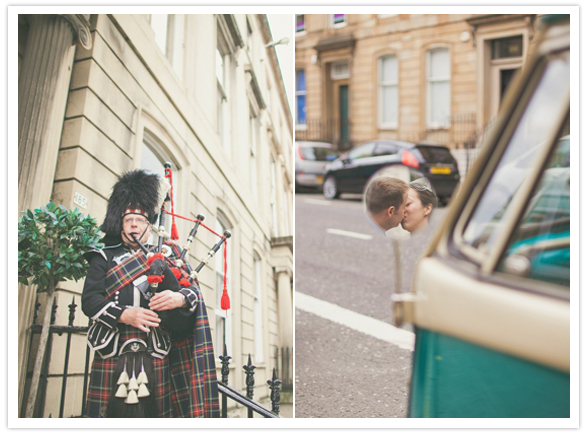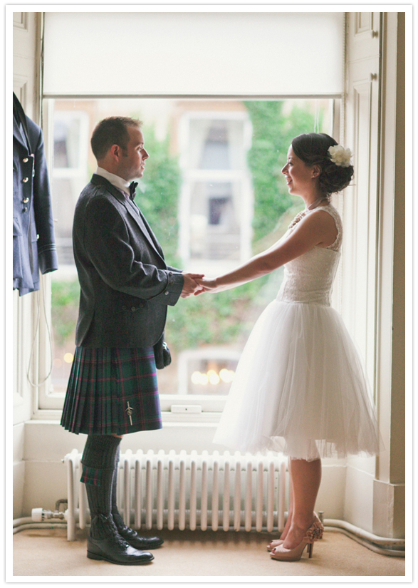 Photography: n.Barrett / Wedding coordinator: Louise MacPherson / Videographer: Sugar 8 / Ceremony venue: University of Glasgow Chapel / Reception venue: Glasgow Art Club / Bride’s dress: Suzanne Neville / Reception dress: Kitty & Dulcie / Bride’s shoes: Nina / Jewelry: Nina / Birdcage fascinator: There Once Was a Girl on Etsy / Florist: Little Flower / Bakery: Three Sisters Bake / Invitations: RSVP Candy / Band: The Strides / Makeup: Kat McSwein / Hair: Gillian Cleminson / Bridesmaids’ fascinators: Maddie Lus on Etsy / Bride and bridesmaids’ kimono dressing robes: Singing Slowly on Etsy / Cake Topper: Oklahoma Stencil Company on Etsy / Guest book: Say Anything Design on Etsy / Piper: Piping Services Scotland / Transportation: Ecosse Classic Cars